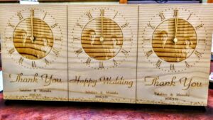 両親贈答品は、一枚板の木目がつながる三連時計。